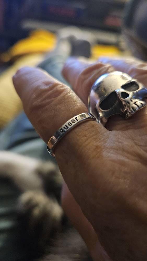This minimalist finger band reads "queer" in vegan ink. It's a great, understated jewelry piece to accessorize with any casual outfit. Get it for yourself or gift it to the friend whose confidence in their gender identity inspires you.